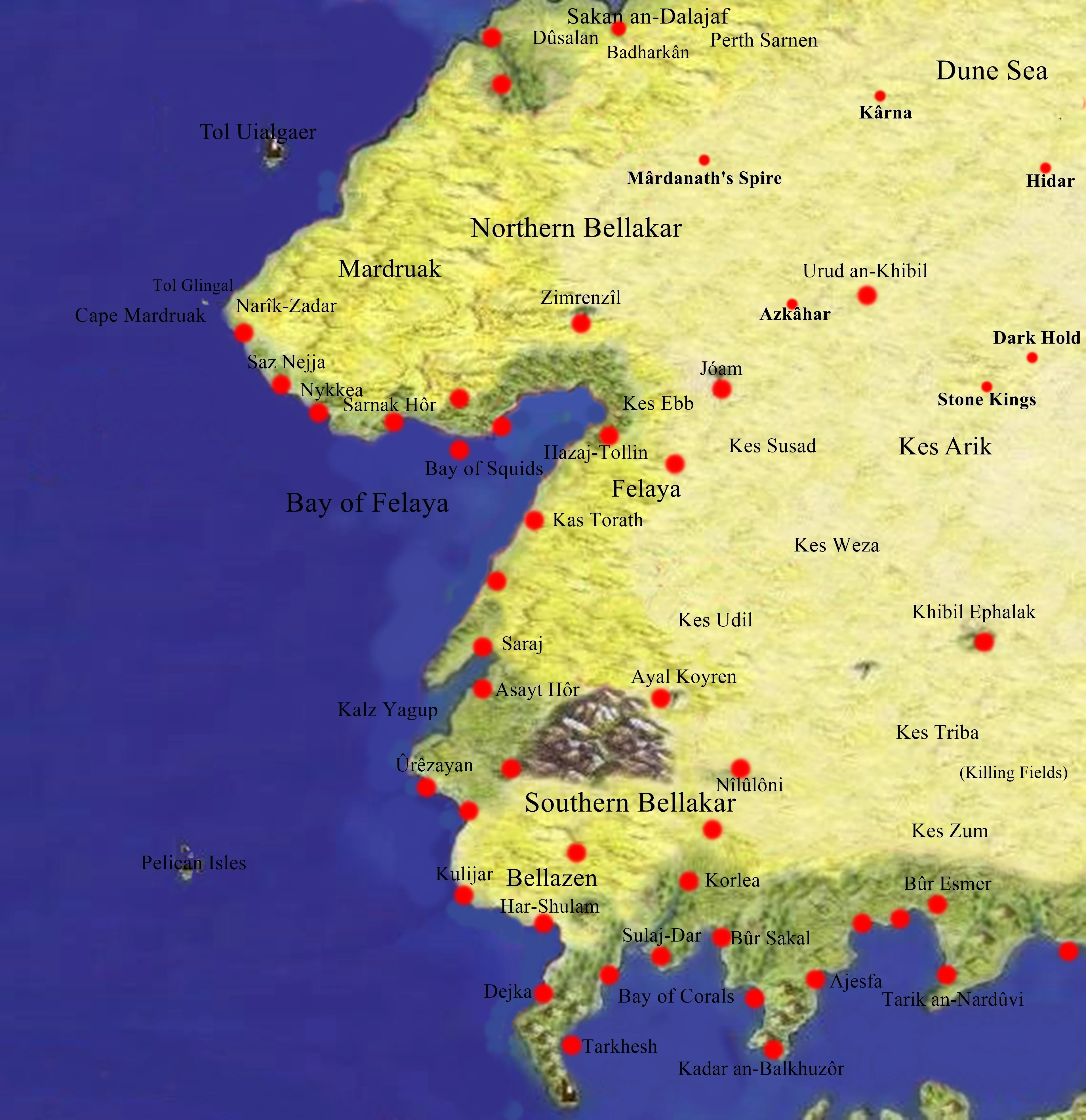 Bay of Felaya Bellazen Cape of Mardurak Cragged Coast Felaya Gondeithel Hau Nysrin Hazaj Tollin Kes Arik Kes Susad Kes Weza Killing Fields Mardruak Northern Bellakar Sakal an-Dalajaf Southern Bellakar Tol Glingal