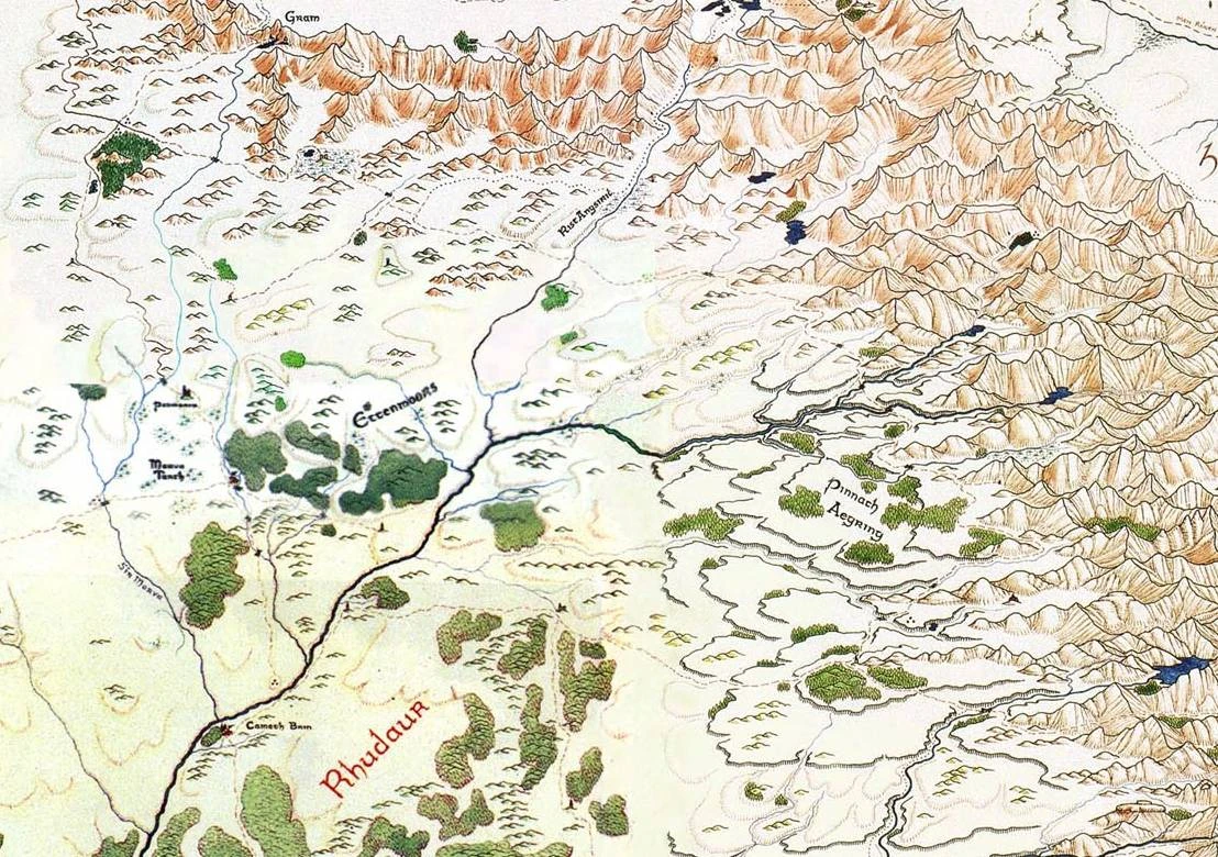 The Highlands of Rhudaur comprised an area of large hills, some rising to over fifteen-hundred feet above their bases.The hills , which ran in irregular curved lines from the southwest to the northeast, were classic fells; that was, they were relatively "young " hills, created by the violent uplifting of the Misty Mountains in the deeps of time.They were jagged and little weathered , holding very little topsoil.These features were particularly true of the northernmost hills, the Ettenmoors, also known by the translation of their Hillmen name, the "Granite Sea".The name did not derive from the many hills, but from the landscape itself, which was strewn with boulders and outcrops of granite.The rocks ranged in size from that of a child's ball to that of a large villa, and they were often grouped in crazy jumbles through which passage was impossible for anything larger than a rabbit.To the south of the Ettenmoors, the hills were smaller and the granite less profuse, forming the region called the Ettendales.