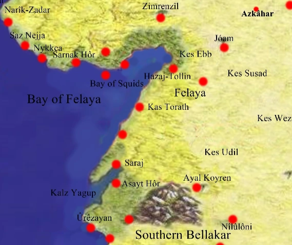 Felayia, the land of the Sun, was dominated by two great cities, Ûrêzâyan and Nîlûlondê, the capital of the mighty realm, the ancient ally of Gondor in the South. Felayia also hosted the two most important forest of Bellakar. In Auz Azunan ("Hills of the Spiritual People") and in Hau Nysrin ("Mountains of Virtue") lived secretly the Honnin and the Cuind Elves).