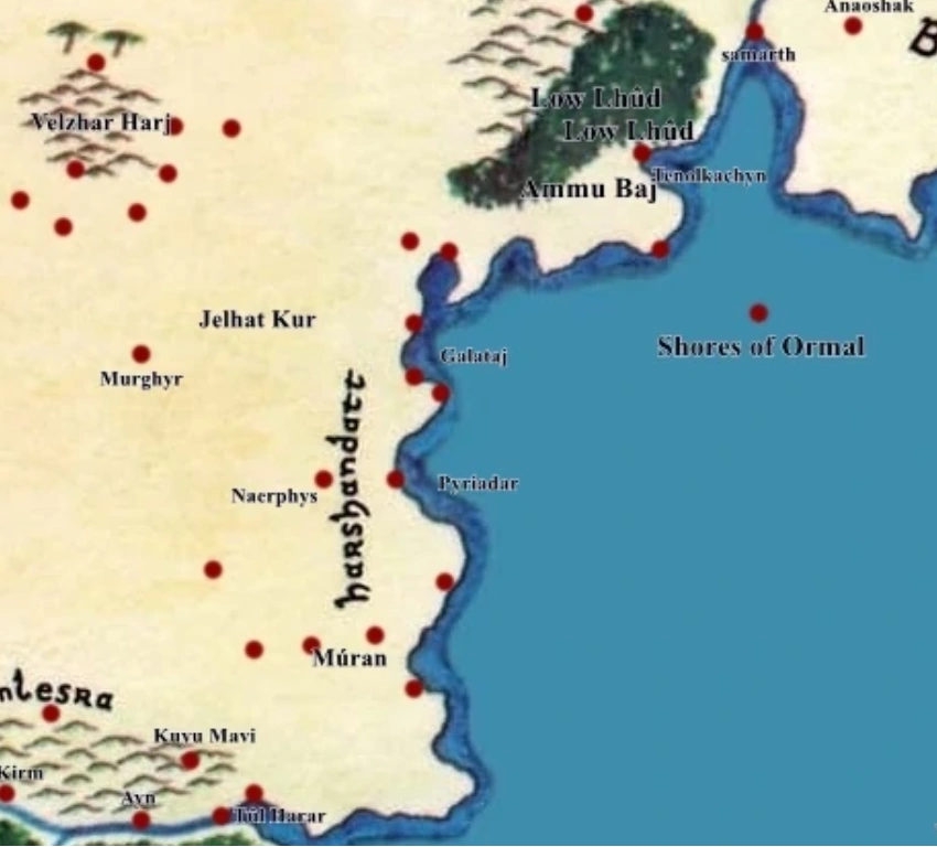 The Gulf of eastern Harad (Ad.:"Khôpazûl, "East-gulf";Har.: "Takar","Red Sea";Av./Khy.:"Ormal Kharg", "Gulf of Ormal") was a bay or inlet of the inner sea lying between Zîrayn and the Khyan Lands.
