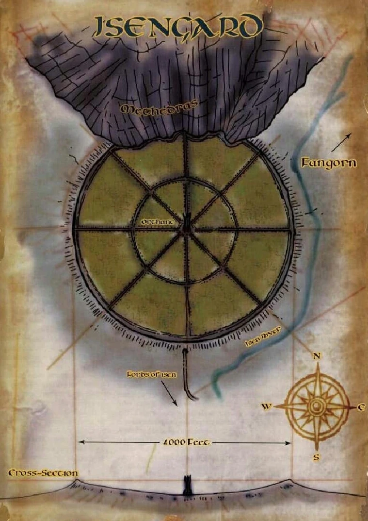 The impenetrable tower of Orthanc formed the core of the defenses, with a vast circular wall one mile in diameter providing the first line of security. The earth itself formed the citadel, for the outer ring was a volcanic cone shaped by the Men of Númenor with the help of Hill-giants and the spire of Orthanc was in fact a pillar of glossy black volcanic rock known as laen.