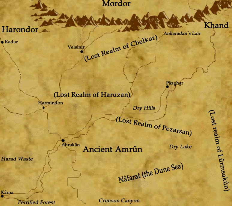 Lostladen, later known as the Desert of Lostladen, was a southern land and former kingdom ruled by Númenóreans. Ever since the Ban of the Valar restricted the Númenóreans from sailing West, many began to explore the eastern part of the world and the shores of Middle-Earth. A large group of Númenórean colonists traveled for days to reach this beautiful country and made it their nation in S.A. 600. Ruled by the kings during the Second Age, Lostladen began to slowly fall into ruin when a civil war broke loose following Númenór's destruction. In the mid-Third Age Lostladen was ruled by two major desert-rivers, the Óde Pézar and the Óde Shelkâr, and was home to three near-haradron Kingdoms known as Shelkâr, Pezarsan and Harûzan, during the later Third Age however the rivers ran dry and the region became more and more inhospitable and the desert took over the land, leaving only small desperate tribes of nomads left.