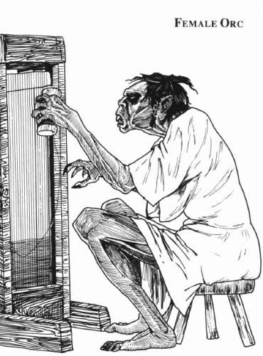 It was stated in the Quenta Silmarillion that Orcs "multiplied after the manner of the Children of Ilúvatar".[35] Unlike the other peoples of Middle-earth, Orcs did not marry, they simply bred. Orcish females of child-bearing age were kept together in a secluded area of the Orcish domain, guarded and accessible only to the stronger males. Foreigners were never permitted to see the female Orcs, explaining their general absence from historical accounts and even suspicion among other races as to whether or not female Orcs existed at all.[36]