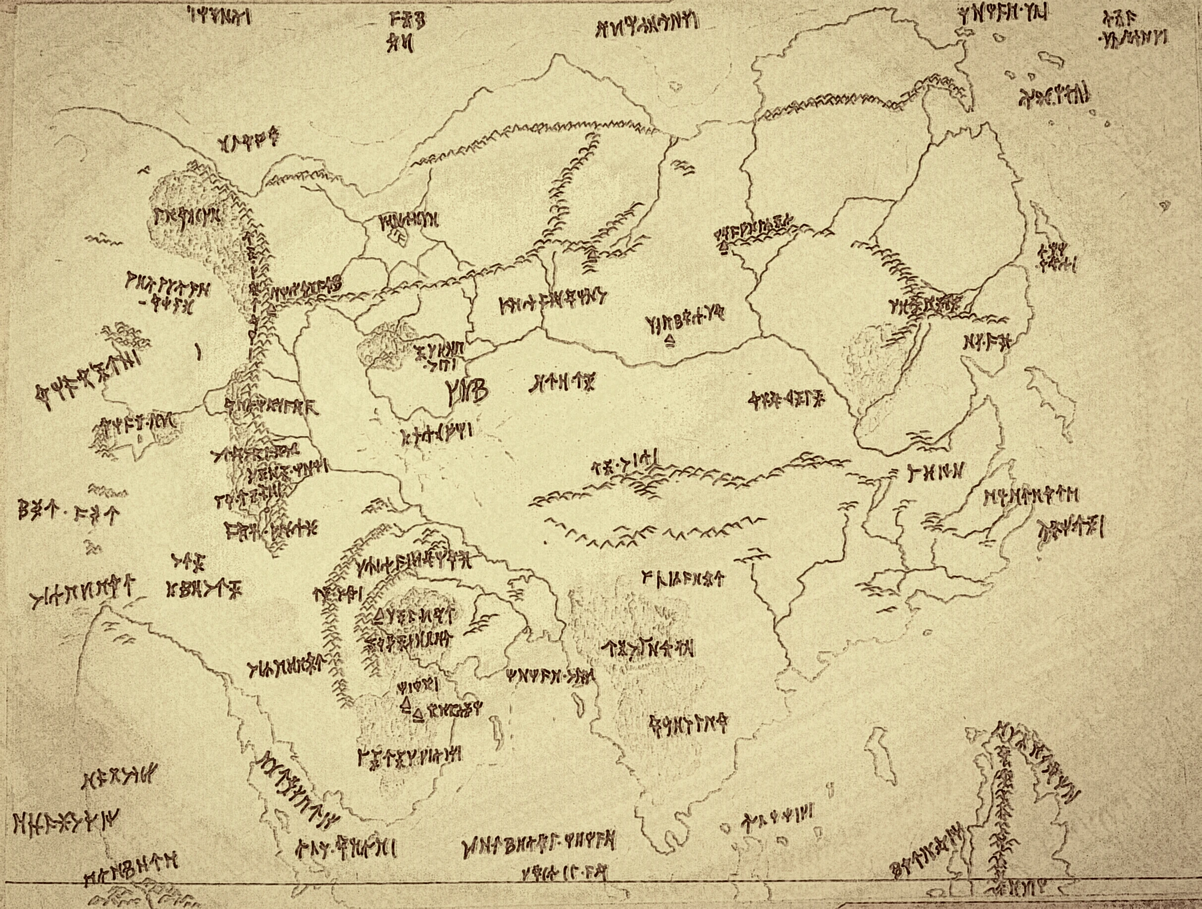 Rhûn the Great was the vast eastern subcontinent of Middle-earth, over 17 million squaremiles stretching from the Iron Mountains in the Far North to the [[inner seas in the central south. It was bordered to the east by the Eastern Ocean and to the west by the western banks and Hills of Rhûnaer, the Inland Sea of Rhûn, and beyond Palisor the wide Sward-lands, dotted by Great Pinewoods. Utumno had once been located in the center of the Northern lands but it was destroyed in the War of the Powers, leaving behind a vast bay that reshaped the northern coastline. To the east of this bay stretched the Northern Peninsula, it's eastern end maked by a second gigantic bay once formed by the fall of Illuin while the Northeastlands stretched toward Easterness or the new lands, once connecting them with Middle-earth by an Old landbridge, eastern twin to the Helcaraxë. Dark and Slumbering Woods, vast taiga stretched from the Iron mountains towards the lakes and grassplains in the south. Icy Seas and Cold Islands marked the polar maritime edge, further north lay only unformed waste and the northern dome of Ringli. South of the bay were the great forests and the Cracks of Illuin, deep fissures and ravines caused by the same cataclysm. Further stood the Roots of Helcar, a mesa or plateau believed to have been the foundation of the fallen lamp. The central region of Rhûn was known as Endon or the "Middle land", dotted by vast Lakelands, with once Great Isles, remnants of a once gigantic inland ocean, the sea of Helcar, and the Great East Plain, and wide Steppes, as Helcar gradually receded over time. West of the Orocarni mountains lay Cuiviénen, the place where the Elves first awoke. Though once a great bay within the inland sea it vanished as Helcar diminished and the land shifted. To the east of Endon rose Dark and Far eastern mountains, which formed a formidable barrier. Between Palisor and these mountains lay great deserts and wastes, including the Last Desert, home to the legendary Were-worms, marking the final arid expanse before the eastern highlands. Beyond the mountains to the east lay Amrûn, "sunrise", Dark Forests of the East and the Eastern Coastlands, which faced the Eastern Ocean like an eastern mirror image of ancient Beleriand. The Men of the West knew little about these lands and called them the "Dark East" or "East of East". Offshore lay Eastern Isles, as the Islands of Sunrise, scattered along the horizon. South of Endon, the terrain transitioned into the Southern Middle-lands, where the Iron Forest stood, once considered the center of the world. West of the Iron Forest rose the Mountains of the Wind, enclosing the valley of Murmenalda. This region was part of the Land between the rivers, a fertile and ancient basin. Within it lay the Dark Forest and it had once been known as Hildórien, land of the awakening of the first men, also site of the first temple dedicated to Morgoth as the early men bowed before "the radiant", but it was said it drowned beneath the later Bay of Hildorien. North of it stretched the Wild Woods, while east of it lay the Southern Forests, forming another vast belt of ancient woodland. Further south, the lands extended toward the Bay of Ormal, named after the fallen lamp Ormal a large outlet into the Inner Seas. Either the shaking of the world during the War of Wrath or the great cataclysm after the drowning of Númenor caused the destruction of the long southeastern Yellow Mountains and possibly led to the formation of the Southern Archipelago and the eventual fragmentation of the continent of Southerness into three distinct smalker landmasses. Southeastern isles once connected the northeastern tip of Southerness to middle-earths Southeastlands.