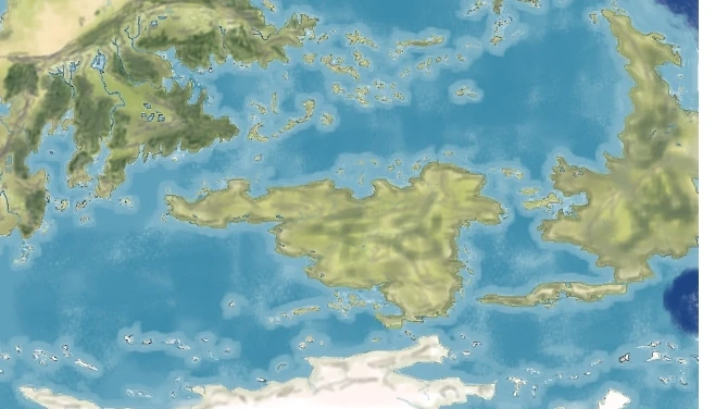 After the world was made round and Númenor was sunk, these colonies confederated as the realm of "Girt by Sea" ruled by a duke or Duchess while Ciryancar I was the first to claim the title " Lord of the Pearl Coasts". While thought of as hereditary at first, the dukedom passed to an elected position chosen by all free males, though it was common for dukes to be related, as well as for female duchesses to be chosen. In the early Third Age, the descendants of the colonials were attacked by those that they recognized as Haradrim, likely from Southeastlands or Southern Middle-lands of Middle-earth. It was known that Sakalnî was Duchess of the realm in T.A. 1,432, and that her grandson Duke Pelakthôn was the first to truly make alliances with the Old Ones to defeat the Cold Ogres.