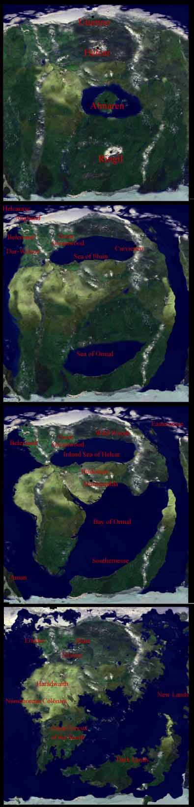 From top to bottom: Arda at the start of creation, during creation, in the First Age and in the Third Age.