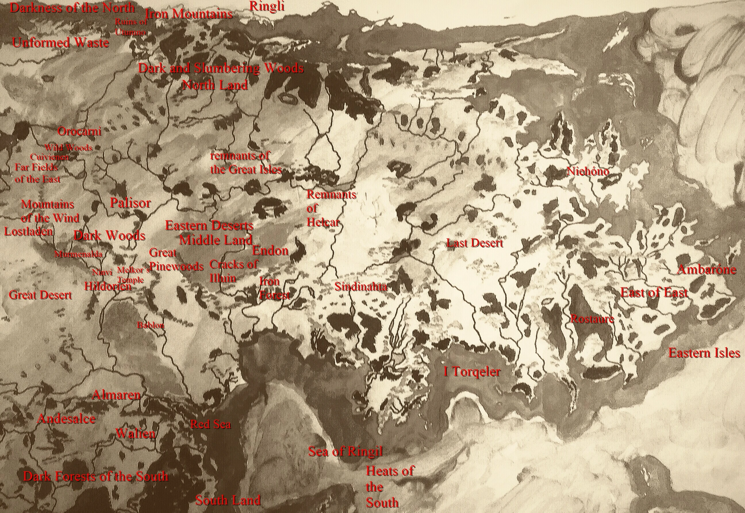 Abyss · Aerie · Almain · Almaren · Ambaróna · Ambarónë · Amrûn · Ancient Darkness · Andesalcë · Archipelagos · Asia · Astolat · Avakúma · Bablon · Barren Lands Belmarie · Black cliffs · Black Mountains · Blessed isles · Burning domes · Burning South · Burnt Land of the Sun · China · Cinderion · Circles of the World · Cliff-eaves · Cool Harbour · Cold and Empty Sea · Cragged Coast · Cursed Isles · Dark and Slumbering Woods · Dark Forests of the East · Dark forests of the south ·Dark land · Dark Lands · Dark mountains · Dark Pools · Dark Regions · Dark Sea · Dark Waters · Dark and Slumbering Woods · Dark Woods ·Darker South · Darkness of the North · Darkest east · Derrilyn · Deserts of the Sun · Dome of Night · Door of Night · Dor-Winion · Dorwinion · Dwellings in the Void · Earth-middle · East of East · Eastern Coastlands · Eastern Deserts · Eastern Isles · Eastern Land · Eastern Mountains · Eastern shores · Easterness · Elvet Isle · Empty Sea · Empty Space · Enchanted Isles · Endon · Eneadur · Evereven · Everlasting Dark · Faerie · Fair Gardens · Fantasie · Far eastern mountains · Far Fields of the South · far fields of Rhûn · Far South · Far Sunlands · Farther South · Fire Mountains · Furthest east Firmament · forest cursed · Forests of the South · Glittering sand · Glooming caves · Gobi Desert · Golden City · Great Desert · Great Forests · Great havens of the sun and the moon · Great Isles · Great mountain island · Great Northern Woods · Great Pinewoods · Great Shadows · Great wildernisses · Green rill · Greenlands · Grey Mountains of Harad · Grey Seas · Harbourless Isles · Harwan · Heart of Eä · Heats of the South · Helcar · Hildorien · Hills of Faraway · Hindukoosh · Houseless Woods · Icelands · Icy Seas · Illuin · Iron Forest · Islands of the South · Isle of Iverin · Isle of the Old Man · Isle of Seabirds · Isle of Ungolianth · Islets Forlorn · Japan · Kalormë · Land of Magic · Land of Strange Men · Land of the Sun · Landatavárë · Last Desert · Little Isles · Lost Westerfalm · Lostladen · Luthany · Magbar · Magic Isles · Many isles · Marsh of Tode · Meadow-Lands · Mediterranean · Menel · Merlock Mountains · Meshes of night · Middle land · Mid-land · Midmost region · Murmenalda · Nameless Plains · Narrow Sea · Nemorie · Néni Erumeär · Nether Darkness · New Lands · Ninvi · Noisome Waters · North Land · North Sea · Northern Darkness · Northern Desert · Northern isles · Northern Waters · North-Wind · Ormal · Orocarni · Oronto · Oroti Ránaron · Ossory · Outer Dark · Outer Lands · Palisor · Pine-woods · Rainforest · Red Palaces · Red Sea · Remote Regions · Ringli · Roots of the Earth · Rostaurë · Rotting River · Rum · Sad Isle · Sahóra · Salkinóre · Seventeen rivers · shadow-land · shadowy isles · Shining Isles · Shining seas · Silent beach · Sindanórie · Soundless Sea · South Land · South of the world · Southern Dark · Southern Forests · Southern Heat · Southern lands · Southernesse · Strait of a mountainous land · Straits of Ice · Straits of the World ·Sunlands · Surrounding Forest · Thellamie · Timeless Void · Tol Meneltarma · Tol Thúle · Tol Uinen · Tolli Kimpeleär · Tolli Kuruvar · Turqeler · i Torqeler · Tramorie · Tumbled Lands · twilight lands · Twilit isles · Unexplored Forests · Unformed waste · Uttermost East · Utumno · Vanished Isles · Voids of Eä · Walien · Wall of the Sun · Walls of the Night · Western Isles · Western Waters · Wide Wood · Wild east · Wild Isles · Wind Mountains · Wild woods · Wilds of Europe · Wood of hanging Trees · Woods and forests of the south · Yellow Mountains