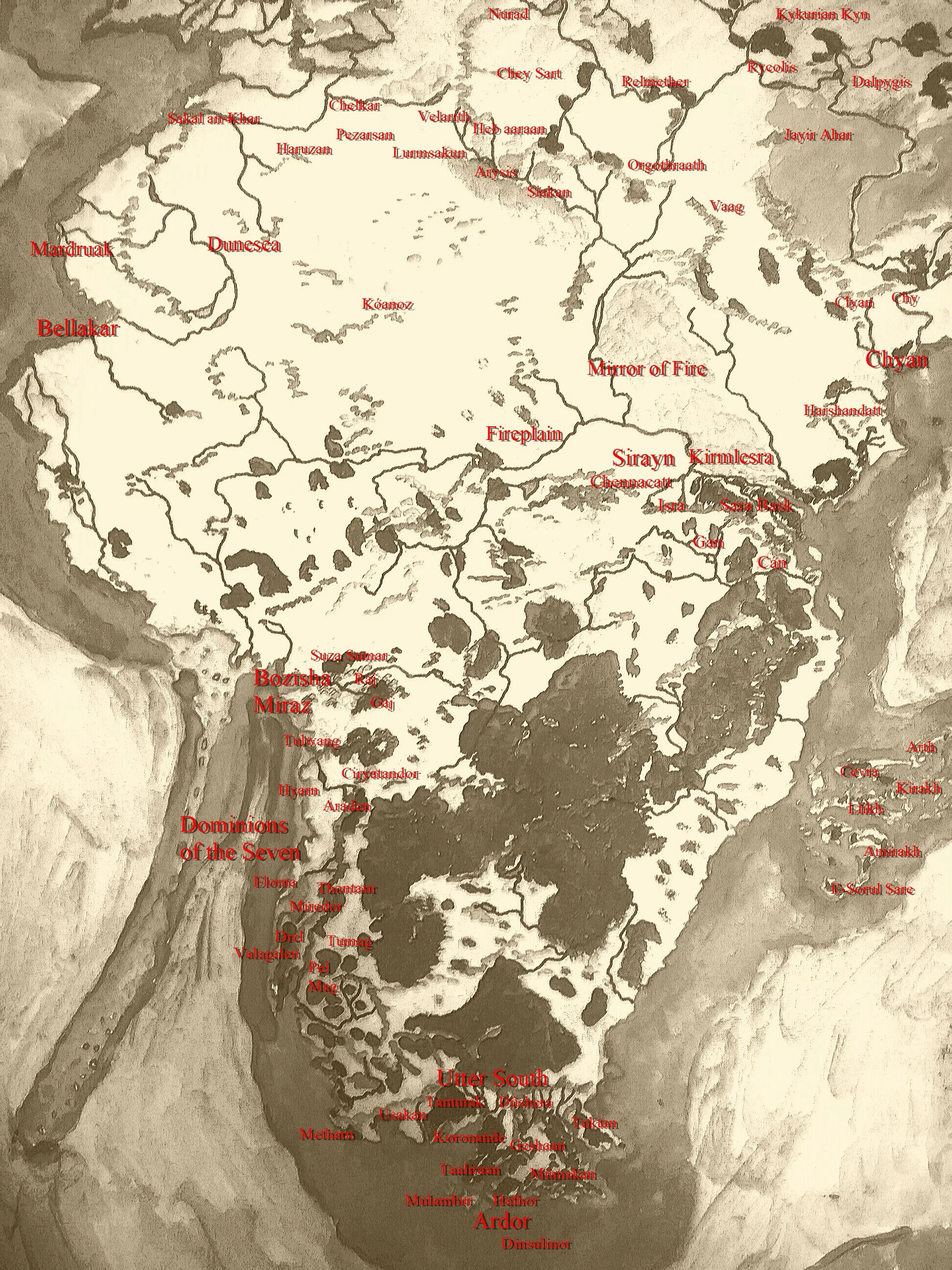 Adea Hu · Aegan · Aigvalg · Alduryaknar · Amirakh · Angclax · Araden · Ardor · Arg-Sîmorîg · Arth · Avikangsdar · Bozisha-Miraz · Brôd · Bulchyades · Burskadekdar · Cevra · Chennacatt · Chey Sart · Chy · Chyan lands · Címóníemor · Ciryatandor · Clyan · Codya · Cuivac Wômaw · Cuivienen · Daldunair · Dalpygis · Desdursyton · Dînsûlinor · Dir · Drel · Durmaw · Dûshera · Dyr · Eligmar · Elorna · Emreth · E-Sorul Sare · Faelaan · Fëamardi · Fenfenen · Gaathgykarkan · Gan · Geen · Geshaan · Góak · Gosti Hyr · Haen · Harshandatt · Hathor · Heb Aaraan · Helcar Sael · Helcarth · Helkanen · Hent · Horl · Hôrm · Hyarn · Ibav · Irakh-Chain · Isle of Sunrises · Iskahú · Isra · Jendiar · Jojojopo · Kael · Ka'ish · Kankanan · Kargagis Ahar · Karn Ord · Kendarca · Kingdom of the desert jewel · Kirakh-Chain · Kirm Lesra · Koronande · Kosth Leer · Kubor sed · Kykurian Kyn · Langurian Kyn · Llikh · Lôchas · Lôchas Drûs · Lódenûly · Lotan · Lú Tyr Sû · Luindor · Luinemar · Lurs Vorganis · Lygar Kraw · Maalon · Mag · Mardruak · Menars · Metharn · Mîrëdor · Mithrisars · Móak · Mulambur · Mûmakan · Mur Fostisyr · Mur Fustir · Myr · Nômirakh · Nûrad · Ogladalo Vatra · Olyas Kriis · Ôm · Orgothraath · Pel · Proric-Peninsula · Prorse · Raj · Ralian · Relmether · Rôlfandas · Ruartar · Ruuriik · Rycolis · Seven lands · Sharthax · Shay · Sîrayn · Suza Sumar · Taaliraan · Tâna · Tantûrak · Tarsa · Thontaur · Thuriac Codya · Tuktan · Tulwang · Tumag · Uab · Uax · Ubain · Uiven · Unvirnay · Urd · Urtlagga · Ûsakan · Uster Kryl · Uul · Vaag · Valagalen · V'shrang · Vulm Shryac · Wâl · Waw · Wôl · Wôm Shryac · Wômawas Drûs · Yalf Hurm · Y-Lústurangsur · Zipatoa