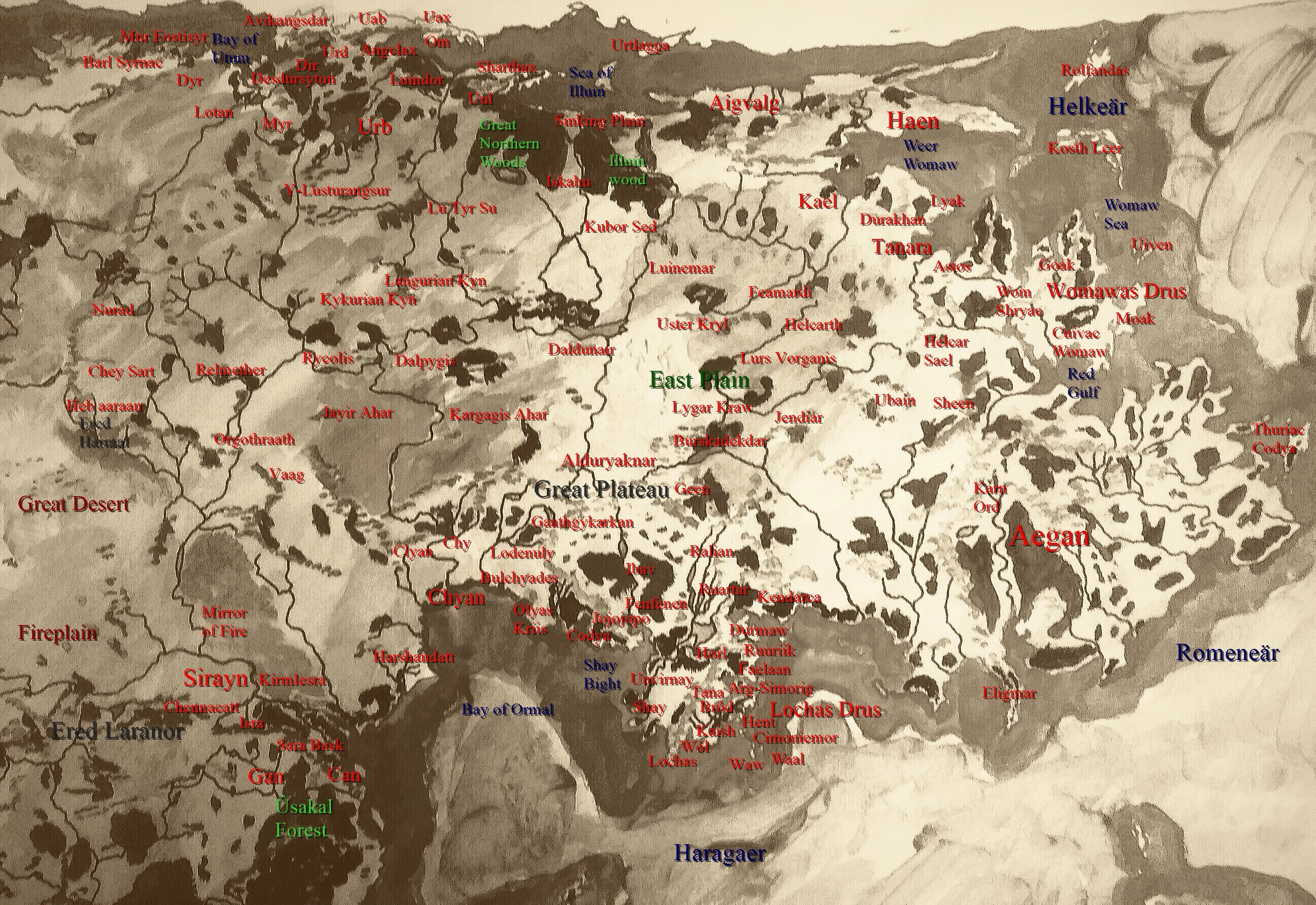 Akeer's Island · Amrûn · Angharad · Arborea · Bâl · Baód · Black Harad · Beor · Cathay · Cracks of Illuin · Cursed land · Dakhûm ·Dôm Fálesh · Dungel · Eastern Gardens · Elanil · Emer · Ered Cernin · Fahal · Gorem · Iron Forest · Irvan's Island · Ishar · Jon's Island · Kei-Urdhasa · Kendoria · Khrim kanan · Kimen Kâh · Kinn-Sâlâ · Kôm · Krinan · Land of Spice · Lands of the Dawn · Last Desert · Latân-Uzg · Meddahar · Mélathîr · Meldor · Mindi · Munba · Neluveh · Olbar's Island · Olyad · Ôn · Orbis · Saka · Sando · Savari · Savax · Slave Coast · Thausiro Ku · Thorm's Island · Thousand Cities · Thunderous Mountains · Tyrannous Mountains · Uiam · Uiól · Ulshy · Unâv · Verya · Xâtl · Yâquîr · Zach's Island