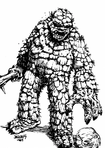 Trolls (S. "Teryg", sing. "Torog") were born in utter darkness. Indeed, they bred underground and spent their waking hours during the night. Wild Trolls shunned daylight and preferred the illumination of a fire to the glistening aura of the moon. Most turned to rock if struck by the sun's rays, as if the spell that created the Teryg became unraveled. Trolls were huge and strong and had thick bodies and powerful limbs. Because they were by nature born of stone, Trolls had an extremely tough, scaly hide that protected them as well as fine, rigid leather armor. Troll-skin varied considerably in thickness, even at various spots on a given Troll, but it was usually strong enough to deflect the blows of most weaponry. The Tereg made formidable foes. There were numerous types of Wild Trolls. Some were grey or brown, others green. All, save Snow Trolls, had flat, often toeless feet, brown or black eyes, and black blood. They could be categorized in any number of ways, but the most common groupings follow (N = non-canonical):
